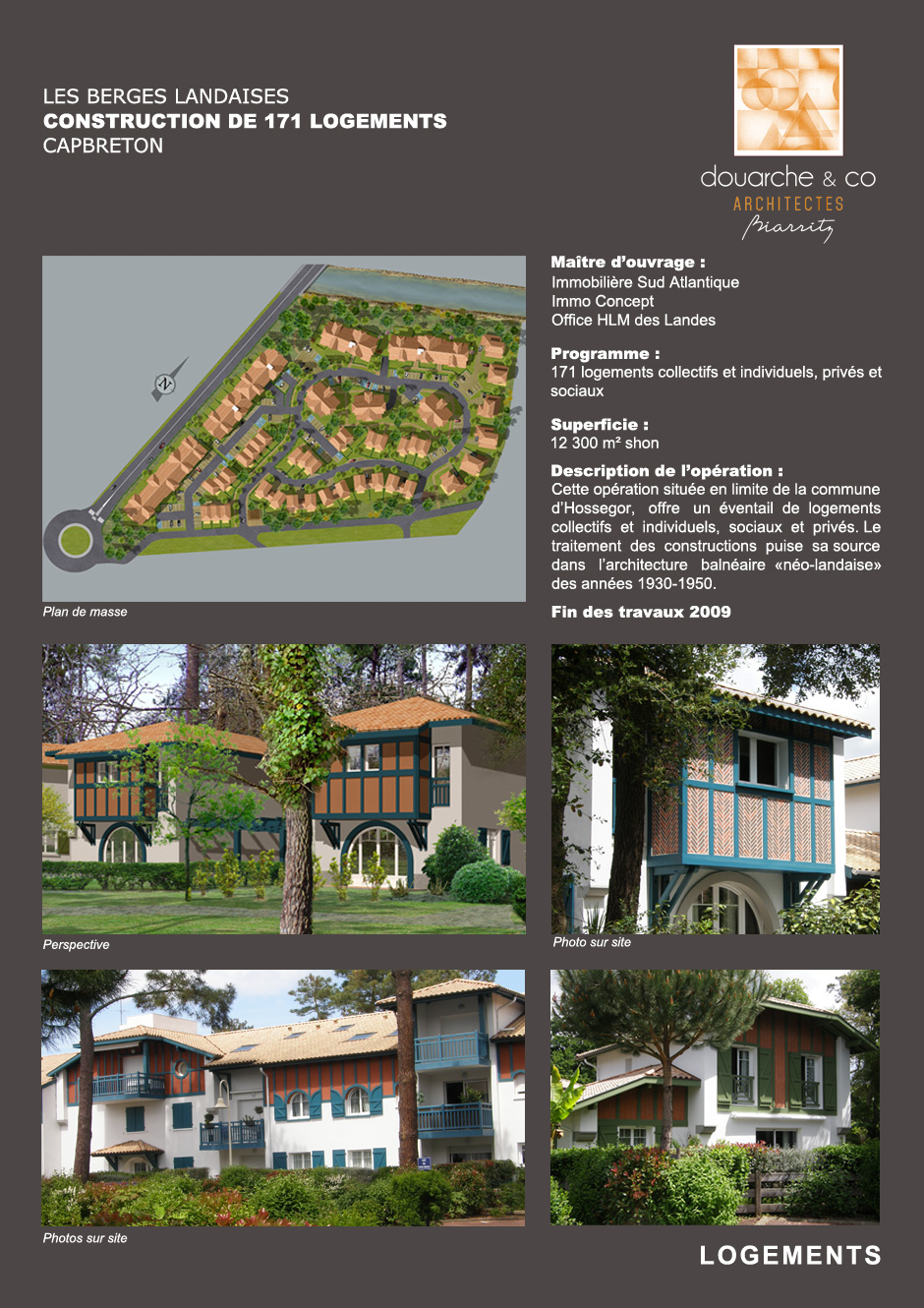 Cette opération située aux limites de la commune d’Hossegor, offre un éventail de logements collectifs et individuels sociaux et privés. Le traitement des constructions puise sa source dans l’architecture balnéaire « néo-landaise » des années 1930-1950